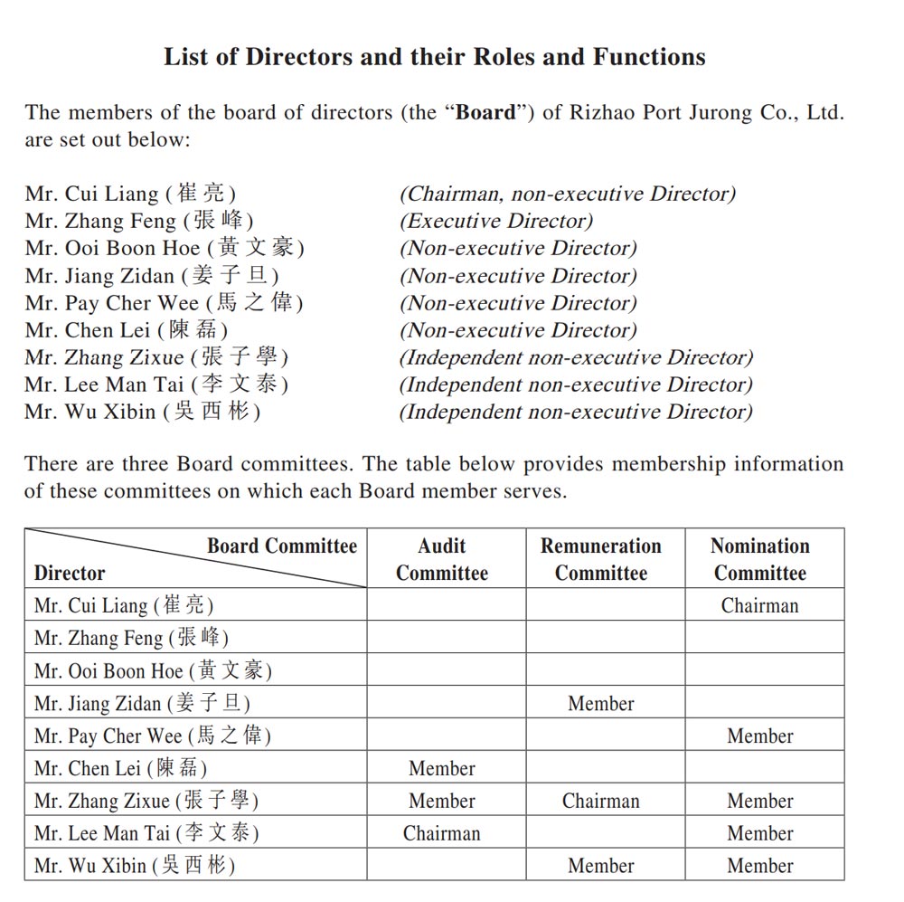 List of Directors and their Roles and Functions of Rizhao Port Jurong Co., Ltd.